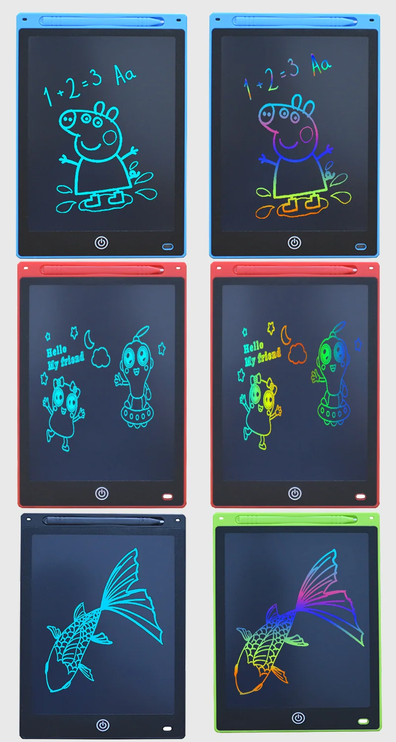La superficie de escritura LCD sensible a la presión hace que su escritura o dibujo aparezca sin demora. Escriba o dibuje con el lápiz óptico de plástico incluido o cualquier otro instrumento adecuado, ¡incluso con el dedo! Fácil operación y alta eficiencia, borra su dibujo con solo tocar el botón de borrado. Diseño ultradelgado y compacto, fácil de llevar y se puede deslizar fácilmente en su maletín, mochila u otra bolsa. Ligero y portátil, perfecto para la escuela, la Oficina, uso doméstico u otro uso. Pila de botón reemplazable incorporada.